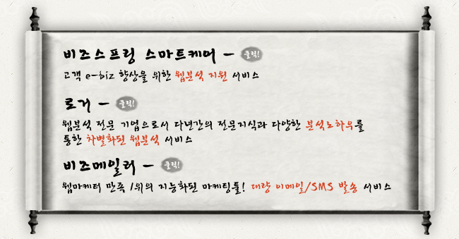 (주)비즈스프링 회사 웹사이트 웹로그분석 ASP서비스온라인 CPC광고 입찰 및 관리 서비스타겟 이메일 및 SMS 마케팅 서비스9년여에 걸친 인터넷 통계 데이터BIZSPRING의 E-BIZ 솔루션 비즈스프링 블로그웹분석 커뮤니티LOGGER™ 일본 서비스(BIZSPRING JAPAN)