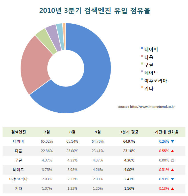 ㈜비즈스프링의 웹분석 통계 자료인 인터넷트렌드™(http://www.internettrend.co.kr)의 를 이용하여2010년 7월 1일부터 9월 30일까지의 통계데이터를 살펴본 결과, 검색엔진 순위에는 변함이 없었다.