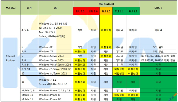 2016년 2월 15일부터 SSL 인증서를 SHA-2로 갱신 [인증서 업그레이드 진행으로 인한 특이사항] Window XP Service Pack 3 미만의 OS에서 InternetExplorer 6, 7, 8 버전의 브라우저를 사용하는 환경일 경우 아래와 같은 제한사항 발생 → 로거에서 https://로 시작되는 영역 (로그인, 회원가입 등의 보안페이지)의 이용이 제한됩니다.