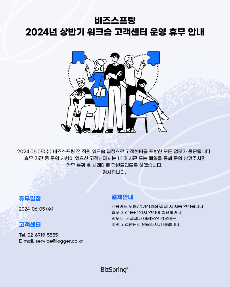 [공지] 2024년 비즈스프링 상반기 워크숍 고객센터 휴무 안내 (2024.06.05(수))