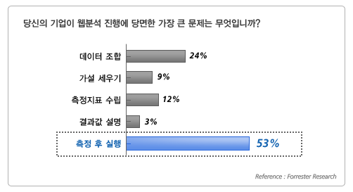 | 해외 리서치 기관 Forrester Research에서 발표한 자료에 의하면 웹분석을 진행하는 기업의 53%가 측정된 값에서 어떠한 액션을 취해야 하는지 모른다는 조사결과 발표한바 있습니다.